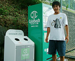 カラバッシュの小さな社会貢献活動 少しまじめなお話しを・・・。春頃からコートの自動販売機とゴミ箱がカラバッシュカラーになっているのを皆様お気付きでしょうか? イメージチェンジ?? と思った方も多いとは思いますが、確かにイメージチェンジにはなってますが、訳は他にちゃんとあるのです。 95年に起こった阪神淡路大震災も記憶から薄らいできています。日々いろんな出来事が起こり日常から忘れられようとしているのは仕方のない事実ではあります。しかし、その被害を受けた、たくさんの震災孤児がいることもまた事実です。年月が経つにつれ、救いの手もやはり少なくなってしまっているのが実情です。 JT(日本たばこ産業)は自販機の収益の一部を震災孤児のために役立てる活動を数年前から始めました。前置きが長くなりましたが、ここでカラバッシュの登場です。今年の春にそのお話があり、カラバッシュは迷うことなくお受けしました。 そして、JTさんの計らいでカラバッシュカラーの自販機になったのです。 テニスでかいた汗の一部がほんの少し役に立っているというお話しでした。